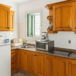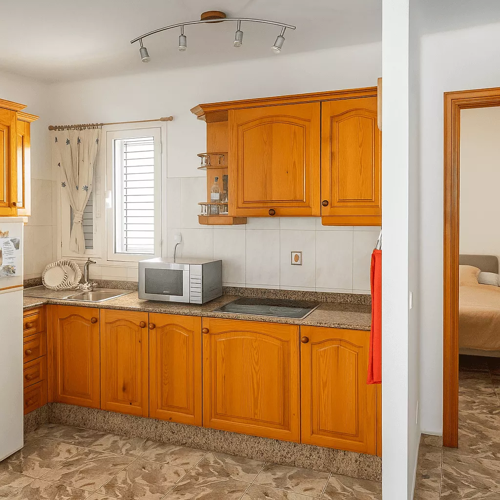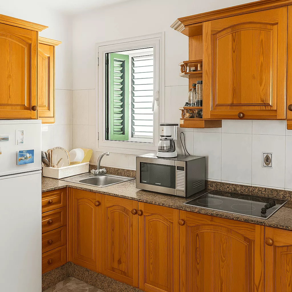 Cocina independiente completamente equipada, con mobiliario de madera en tono cálido y encimera de granito